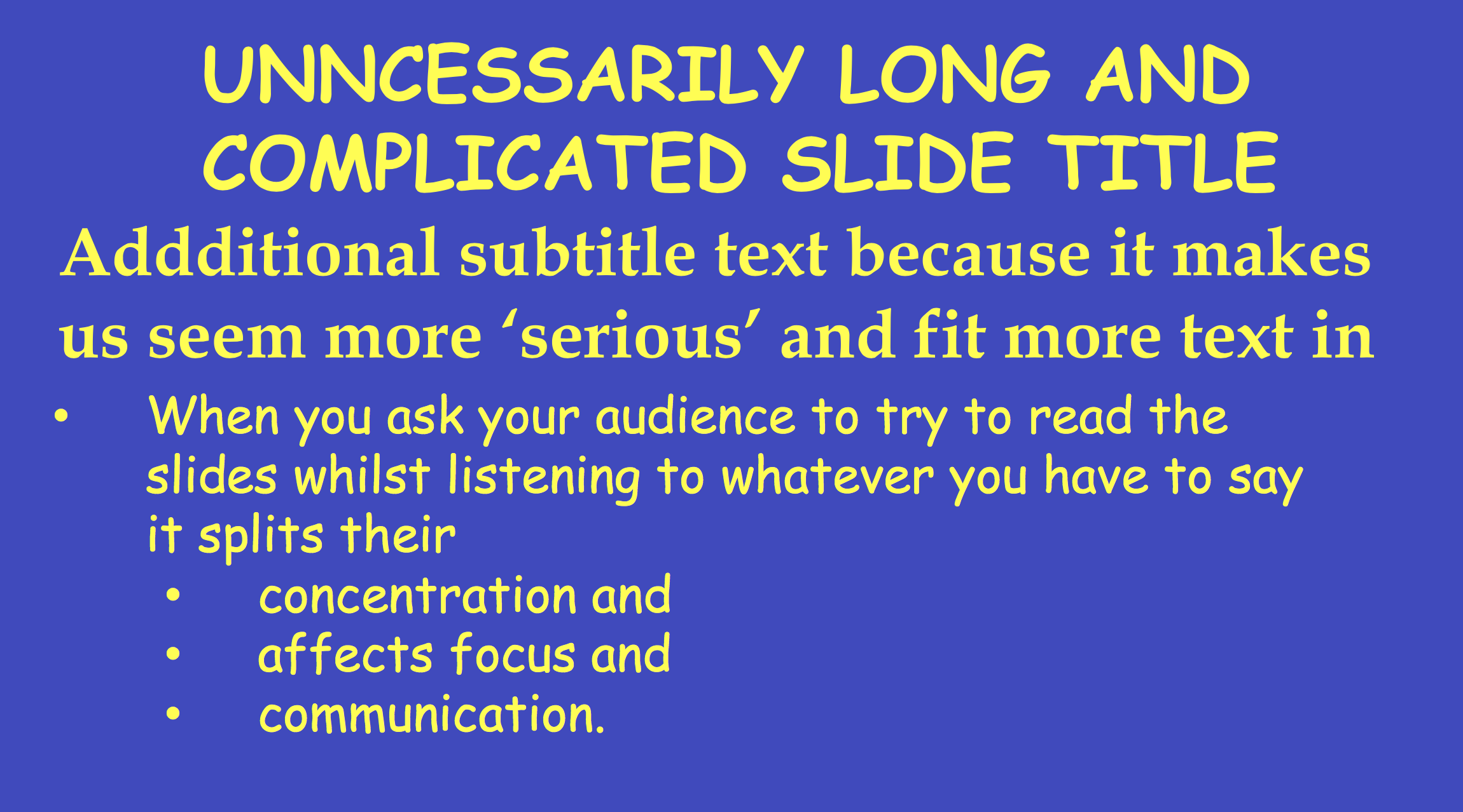 In reality we get a lot of slides like this but there's still room for improvement. This might be useful as part of a Handout or paper notes but not as a Slide to go up for people to tune out of your talk.